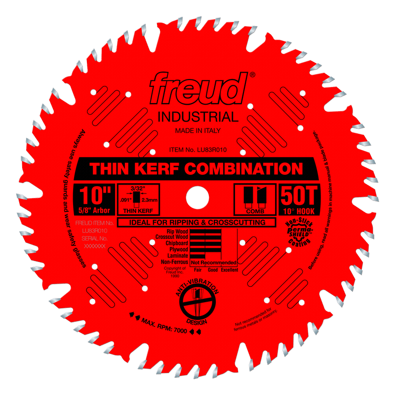 The ultimate combination blade is now available in a thin kerf design for less amp draw and reduced material waste. This ultimate combination blade combines one flat tooth for ripping, followed by four alternate top bevel teeth for crosscutting and a large gullet for effective chip clearance. This blade also features laser cut anti-vibration slots, practically eliminating the vibration that resonates in standard blades. With this ultimate combination blade, there is no need for stabilizers. Ideal For:Crosscuts (3/4" to 3-1/2") & Rips (3/8" to 1-1/2").