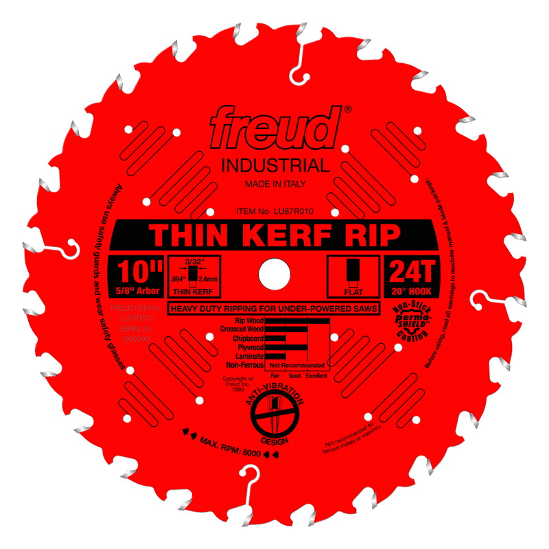 This blade gives new life to underpowered table saws and radial arm saws because the thin kerf does not require much horsepower. The Perma-SHIELD™ coating helps this blade pull 1/3 less on the saw, which translates into over 33% more cutting power. The ideal working range is from 3/4" to 2-3/4" thick. Ideal For:Heavy-Duty Ripping Blades For Underpowered Saws. Depth of cut (3/4" to 2-3/4").