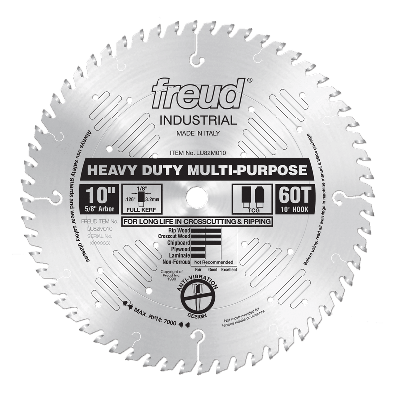 This multi-purpose blade will cut stacks of manmade wood products as well as hardwood and softwood up to 2-3/4" thick. The blade’s deep gullets and TCG rip and crosscut through hardwoods and softwoods with ease. Although the ideal working range is 1/2" to 2-3/4" thick, thinner or thicker materials may be cut, resulting in some loss of surface finish Ideal For:Stacked Chipboard And Manmade Materials. Crosscuts (1/2" to 2-3/4") & Rips (3/4" to 3/8" ).