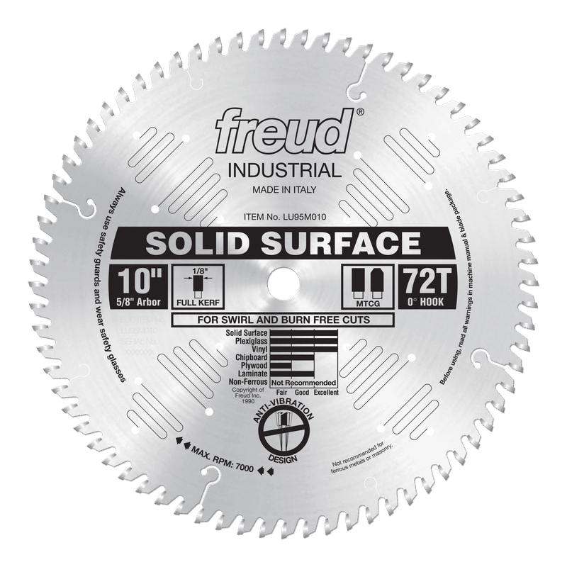 With this ultimate solid surface blade, there is no need for stabilizers. This blade features teeth with a specially designed triple chip grind for leaving swirl-free cuts in solid surface materials such as Dupont® Corian®, Wilsonart Gibralter® and SSV Fountainhead®. The laser-cut anti-vibration slots reduce the sideways movement of the cutting edge against the solid surface material, dramatically extending cutting life. With this ultimate solid surface blade, there is no need for stabilizers. Ideal For:Solid surface materials such as Dupont® Corian®, Wilsonart Gibralter® and SSV Fountainhead®. Depth of cut (1/4" to 1-5/8").