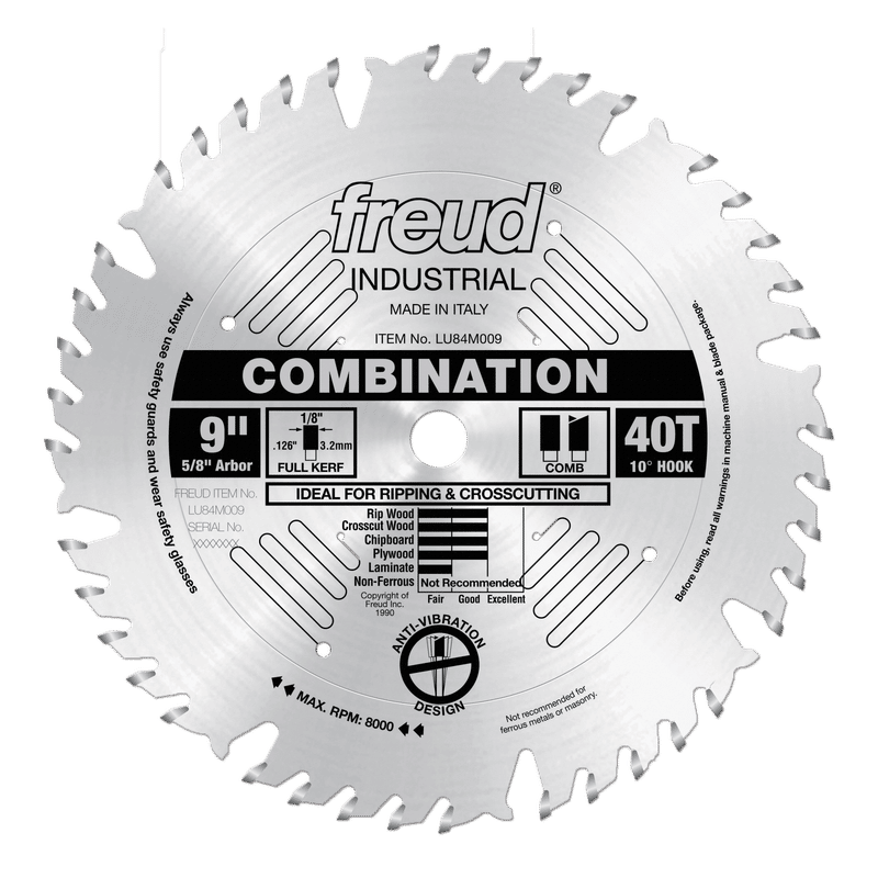 This ultimate combination blade combines one flat tooth for ripping, followed by four alternate top bevel teeth for crosscutting and a large gullet for effective chip clearance. This blade also features laser cut anti-vibration slots, practically eliminating the vibration that resonates in standard blades. With this ultimate combination blade, there is no need for stabilizers. Ideal For:Crosscuts (3/4" to 3-1/2") & Rips (3/8" to 1-1/2").