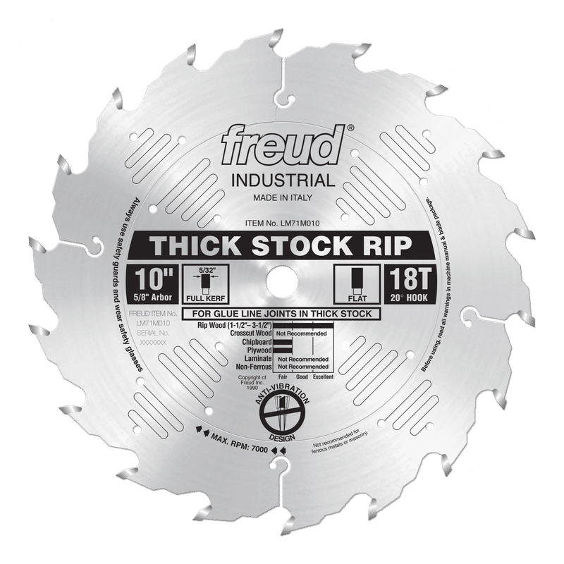 This blade is ideal for high-speed ripping operations in hardwood and softwood. The low tooth count also makes this blade ideal for ripping thick material. It can be used with manual feeding as well as with power feeders in single or gang-ripping operations. The ideal working range is 1-1/2" to 3-1/2" thick. Thinner or thicker material may be cut, but some loss of surface finish may occur. Ideal For:High-speed ripping operations in hardwood and softwood. Depth of cut (1-1/2" to 3-1/2").
