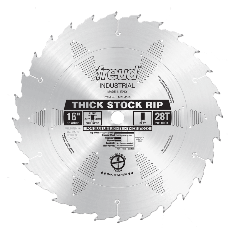 This blade is ideal for high-speed ripping operations in hardwood and softwood. The low tooth count also makes this blade ideal for ripping thick material. It can be used with manual feeding as well as with power feeders in single or gang-ripping operations. The ideal working range is 1-1/2" to 3-1/2" thick. Thinner or thicker material may be cut, but some loss of surface finish may occur. Ideal For:High-speed ripping operations in hardwood and softwood. Depth of cut (1-1/2" to 3-1/2").