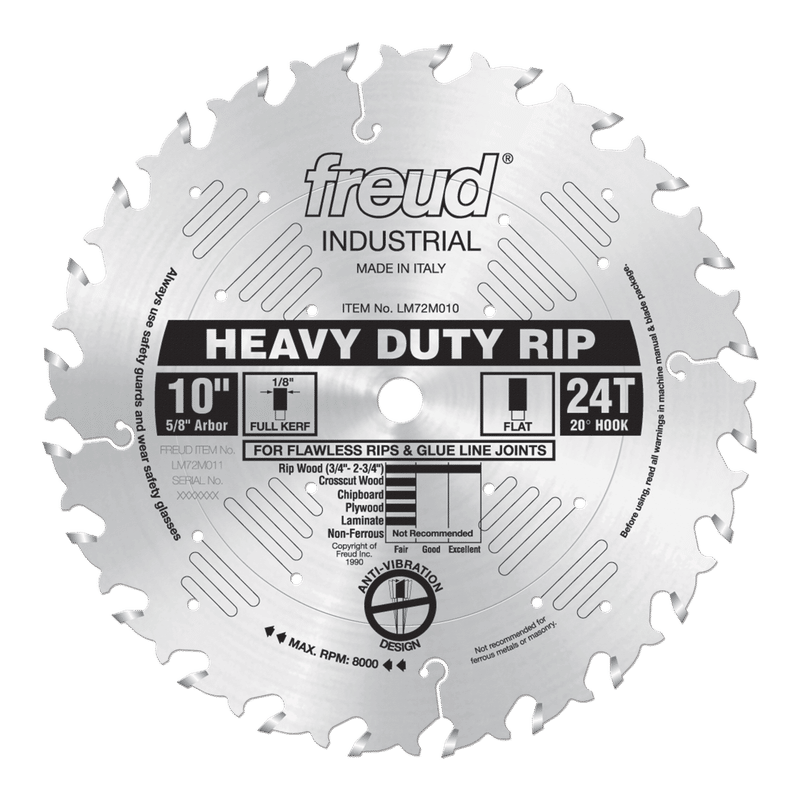 This blade gives smooth, fast rips in hardwoods and softwoods. The combination of a rigid blade body and razor sharp flat top carbide teeth will provide a "glue line" precision cut. These blades are precision balanced and can be used in gang-rip operations. The ideal working range is from 3/4" to 2-3/4" thick. This blade also features laser cut anti-vibration slots, practically eliminating the vibration that resonates in standard blades. With this ultimate ripping blade, there is no need for stabilizers. Ideal For:Smooth, Fast Heavy-Duty Ripping. Depth of cut (3/4" to 2-3/4").