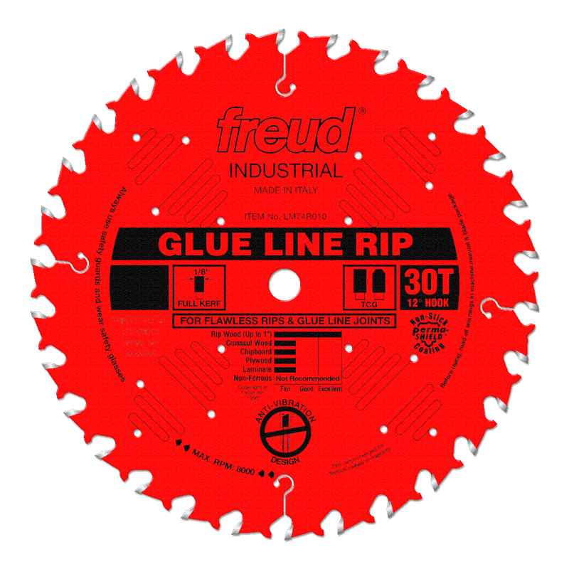 This blade’s specially designed triple chip tooth design produces extremely smooth, true surfaces for gluing and finish work. There is no need for sanding or jointing after the cut. The ideal working range is from 1/8" to 1" thick. This blade also features laser cut anti-vibration slots, practically eliminating the vibration that resonates in standard blades. With this ultimate ripping blade, there is no need for stabilizers. Ideal For:Heavy Duty Glue Line Ripping Blades For Superior Finish. Depth of cut (1/8" to 1").
