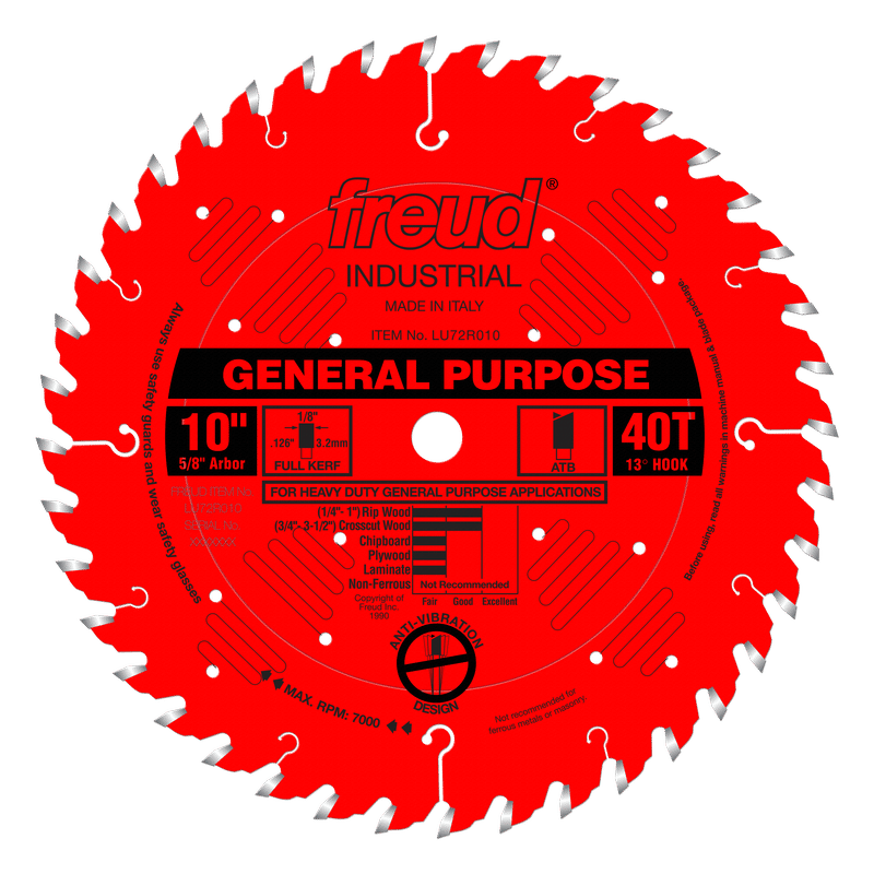 Freud’s new General Purpose blade includes a 30 degree Hi-ATB (Alternate Top Bevel) tooth grind for better quality finish and crisper edges in crosscut applications. This blade is ideal for cutting thick hardwoods, softwoods and thinner stock materials that range in thickness from 3/4" to 3-1/2" for crosscutting, and 1/4" to 1" for ripping. The newly added Perma-SHIELD® non-stick coating protects the blade from heat and pitch build-up, allowing for reduced drag and longer cutting life. Ideal For:For Heavy-Duty General Purpose Applications. Crosscuts (3/4" to 3-1/2") & Rips (1/4" to1").