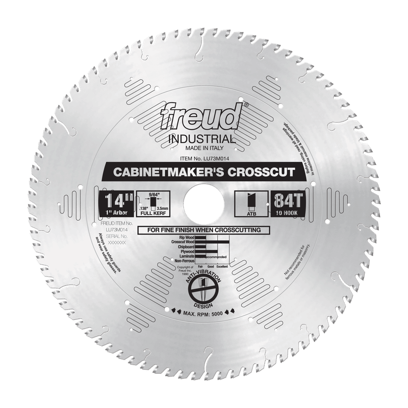 This heavy-duty crosscut blade is designed primarily for heavy use in a cabinetmaker’s shop. Combining a 10° hook angle and the alternate top bevel tooth grind, this blade provides a good crosscut and long cutting life in hardwood, softwood, plywood, and chipboard. The LU73M series is ideal for cutting a wide variety of materials most commonly used by cabinet makers in thicknesses from 1/2" to 2- 3/4" thick. Ideal For:Heavy-Duty Crosscutting Blades Designed For The Industrial Cabinetmaker. Depth of cut (1/2" min to 2-3/4" max)