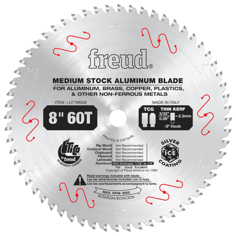 This medium stock, non-ferrous metal cutting blade produces an excellent finish. These blades have custom designed gullets to minimize chip build-up and specially formulated carbide for long life. Freud recommends use of a liquid lubricant when cutting. This can be accomplished with a spray of WD-40 or other lubricant every 4 to 5 cuts. Wax sticks are not recommended. Ideal For:Cutting Medium Non-Ferrous Materials And Aluminum. Wall thickness 1/4" Max.