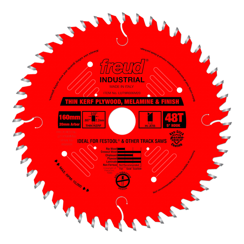 The LU79 thin kerf line of saw blades provides flawless, chip-free edges in veneered plywoods, fine moldings, melamine, laminates, and crosscuts in solid woods. Using advanced technology, Freud developed the LU79 thin kerf line of saw blades that features laser-cut, anti-vibration slots that practically eliminate the vibrations that resonate in standard blades. This blade provides flawless, chip-free edges in veneered plywoods, fine moldings, melamine, laminates, and crosscuts in solid woods. The combination of Hi-ATB tooth design and anti-vibration slots makes these thin kerf blades the ultimate finish blades. The result is a cut so smooth it eliminates the need for a stabilizer or a scoring blade! Ideal For:Flawless Finish In Veneered Plywood, Chip Board, Melamine & Laminates For Virtually Chip-Free Cuts. Depth of cut (1/4" min to 1-5/8" max)