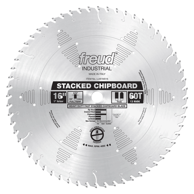 This blade is ideal for sizing sheet goods (chipboard, plywood, laminates, MDF) where speed is more important than a smooth finish or when cutting stacks of material. These blades are best used when cutting plywood and composition material, but they can also be used with hardwood and softwood. Ideal For:Heavy Duty Fast Stacked Chipboard Blades. Depth of cut (1-1/4" to 3-1/2").