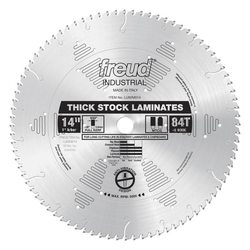This heavy-duty production blade produces an excellent finish on the top and bottom of thick laminates and melamine. The LU92M series is ideal for cutting stacked 3/4" laminates and melamine. Each tooth has a special modified triple chip grind design created by computer simulation to breeze through thick stock and single or double-sided laminates, leaving a chip-free edge. Ideal For:Double Sided Laminates and Stacked Chipboard is ideal for cutting stacked 3/4" laminates and melamine