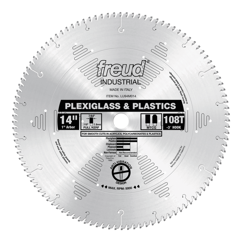 This industrial blade cuts acrylics, polycarbonates and other plastics, leaving a smooth finish without melting. By combining micrograin carbide tips with a specially modified triple chip grind these blades will give a clean smooth cut. These blades produce less heat keeping the cut edge crisp. Ideal For:Plexiglass and Plastics. Depth of cut (1/4" to 1-5/8").