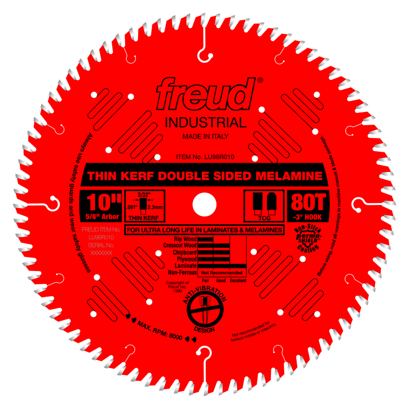 The LU96R is a thin kerf blade that is designed to give long life and excellent finish on the top and bottom of laminates, melamine & veneered plywood. The laser-cut anti-vibration design yields the plate acoustically dead. This reduces the sideways movement of the cutting edge to prevent chipping in manmade materials such as laminates. This dramatically extends cutting life and finish. No scoring blades needed with this blade! Ideal For:Double-sided laminates, melamine & veneered plywood. Depth of cut (1/4" min to 1-5/8" max)