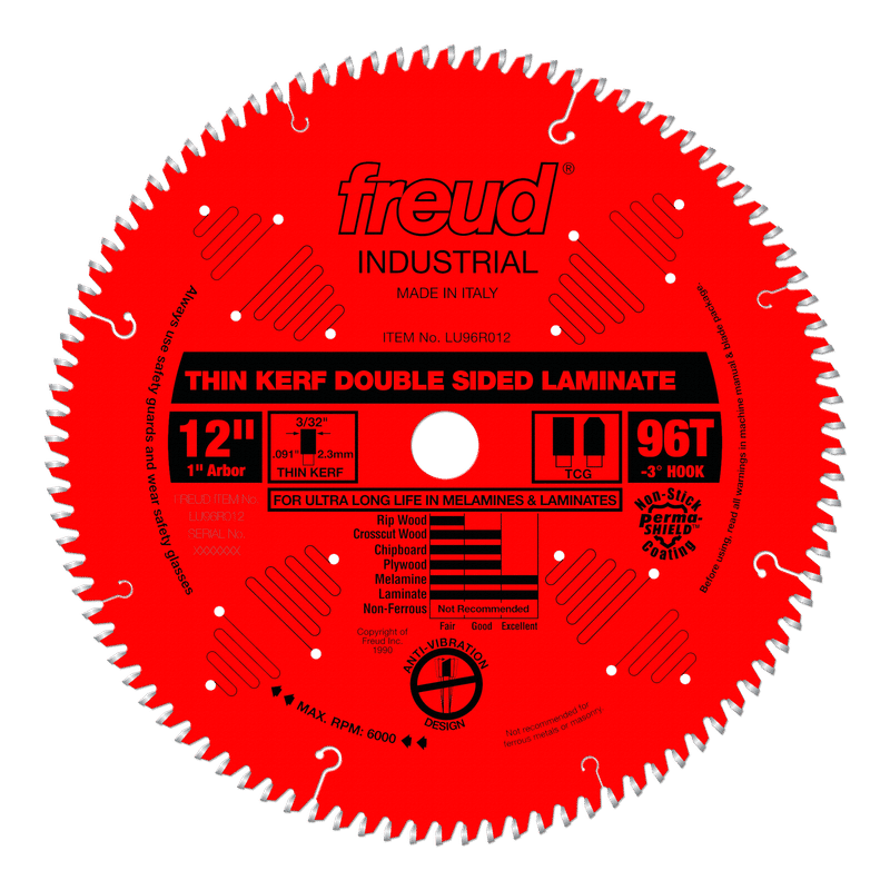 The LU96R is a thin kerf blade that is designed to give long life and excellent finish on the top and bottom of laminates, melamine & veneered plywood. The laser-cut anti-vibration design yields the plate acoustically dead. This reduces the sideways movement of the cutting edge to prevent chipping in manmade materials such as laminates. This dramatically extends cutting life and finish. No scoring blades needed with this blade! Ideal For:Double-sided laminates, melamine & veneered plywood. Depth of cut (1/4" min to 1-5/8" max)
