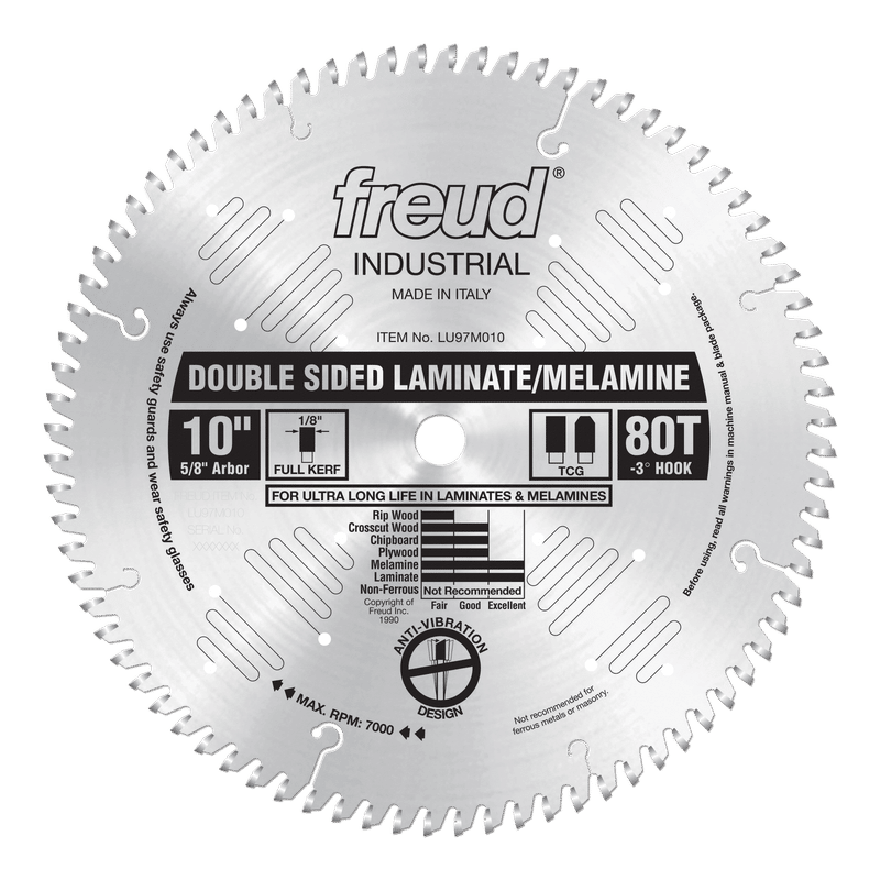 Designed to give long life and excellent finish on the top and bottom of laminates, melamine & veneered plywood. The laser-cut anti-vibration design yields the plate acoustically dead. This reduces the sideways movement of the cutting edge to prevent chipping in manmade materials such as laminates. This dramatically extends cutting life and finish. No scoring blades needed with this blade! Ideal For:Excellent finish on the top and bottom of laminates, melamine & veneered plywood. Depth of cut (1/4" min to 1-5/8" max)