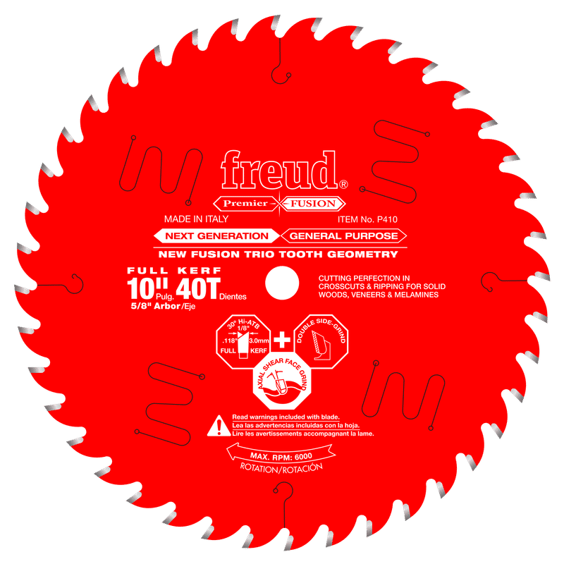 Precision in woodworking is paramount—every cut matters. Typical general-purpose blades often deliver inconsistent accuracy, resulting in imperfect edges, tear-out, and the need for time-consuming rework. These compromises not only reduce efficiency but can impact the quality and fit of your workpieces. Freud sets the standard of accuracy and finish with the Next Generation Premier Fusion blade. Engineered for exacting craftsmen and those who demand uncompromising perfection, this blade delivers flawless, mirror-smooth cuts right off the saw—virtually eliminating the need for sanding or touch-ups. The innovative Fusion Trio Tooth Design and advanced engineering ensure each cut is precise, controlled, and remarkably easy to feed, whether you’re working with hardwood, softwood, laminates, melamine, or veneered plywood. With enhanced ease of feed and superior blade stability, Premier Fusion empowers you to achieve perfect results in less time with absolute confidence. Ideal For:Crosscuts (3/8" to 3-1/2") & Rips (3/4" to 1-1/2") wood, laminate, veneered plywood, hardwoods & melamine.