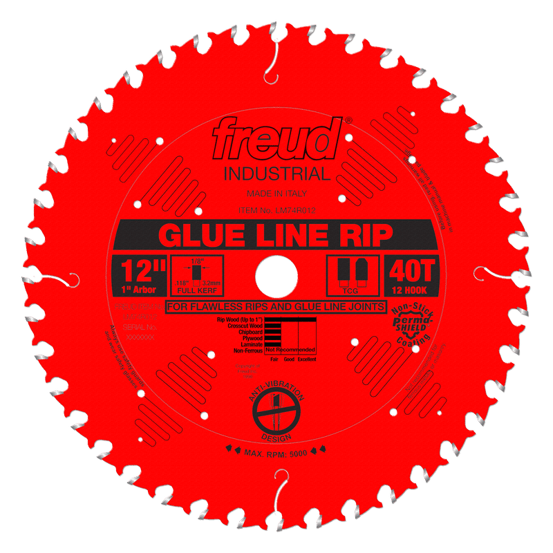This blade’s specially designed triple chip tooth design produces extremely smooth, true surfaces for gluing and finish work. There is no need for sanding or jointing after the cut. The ideal working range is from 1/8" to 1" thick. This blade also features laser cut anti-vibration slots, practically eliminating the vibration that resonates in standard blades. With this ultimate ripping blade, there is no need for stabilizers. Ideal For:Heavy Duty Glue Line Ripping Blades For Superior Finish. Depth of cut (1/8" to 1").
